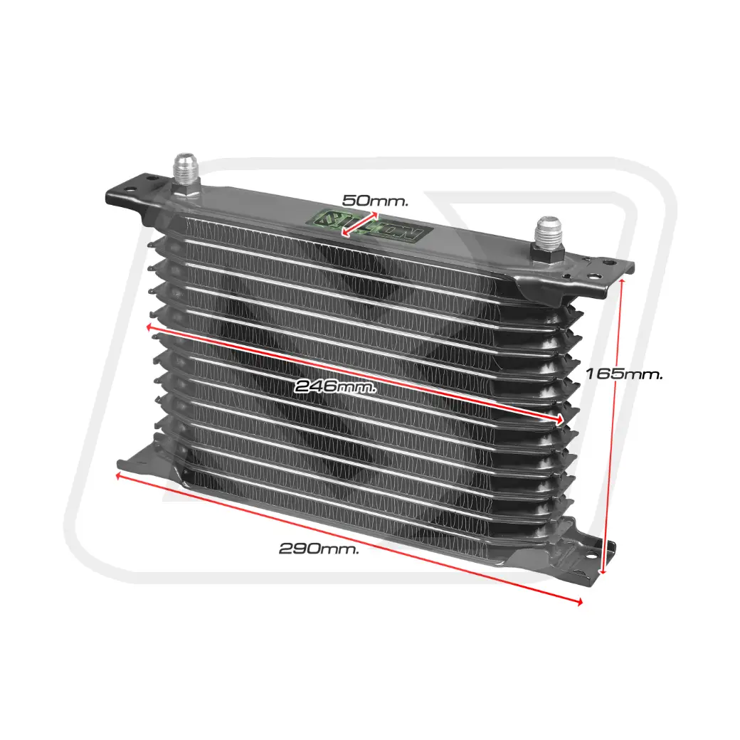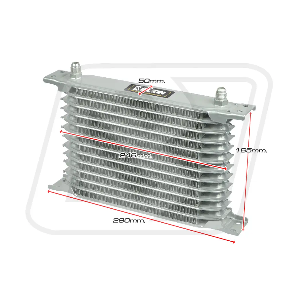 แผงออยคูลเลอร์ Billion JDM รุ่น 13 แถว ความยาว 290 มม. เชื่อมต่อด้วยหัว AN6 ถูกออกแบบเพื่อรองรับการระบายความร้อนของน้ำมันเครื่องหรือเกียร์ในรถที่ใช้งานหนัก เช่น รถแต่ง, รถแข่ง หรือรถใช้งานสมบุกสมบัน