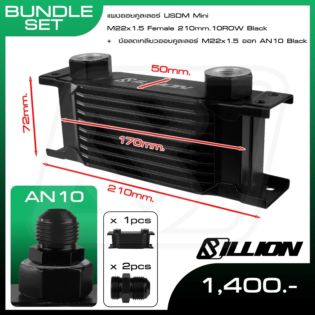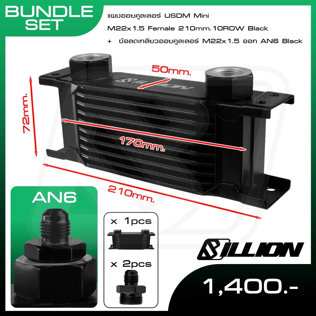 แผงออยคูลเลอร์ Billion USDM Mini 10Row ขนาด 210mm เกลียว M22x1.5 Female ออก AN6 ช่วยควบคุมอุณหภูมิน้ำมันเครื่องให้เสถียร โครงสร้างแข็งแรง ขนาดกะทัดรัด เหมาะกับรถซิ่งและรถใช้งานสมรรถนะสูง