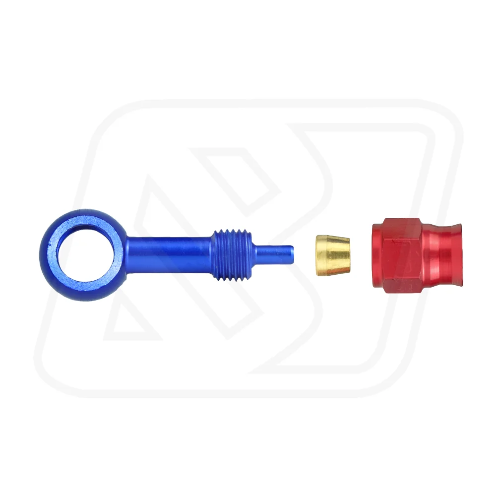 Billion PTFE AN3 Banjo Bolt หัวบันโจสำหรับระบบน้ำมัน AN3 แบบตรงและ 45° ผลิตจาก อลูมิเนียม CNC แข็งแรง ทนทาน พร้อมท่อ PTFE ภายใน ลดการรั่วซึมและทนความร้อนสูง สี BLUE-RED/BLACK ดีไซน์สวยงาม ติดตั้งง่าย