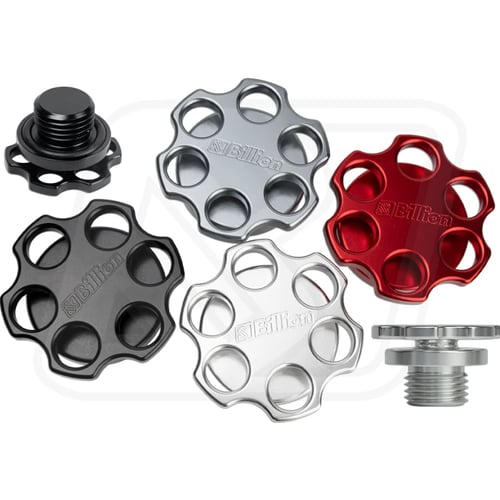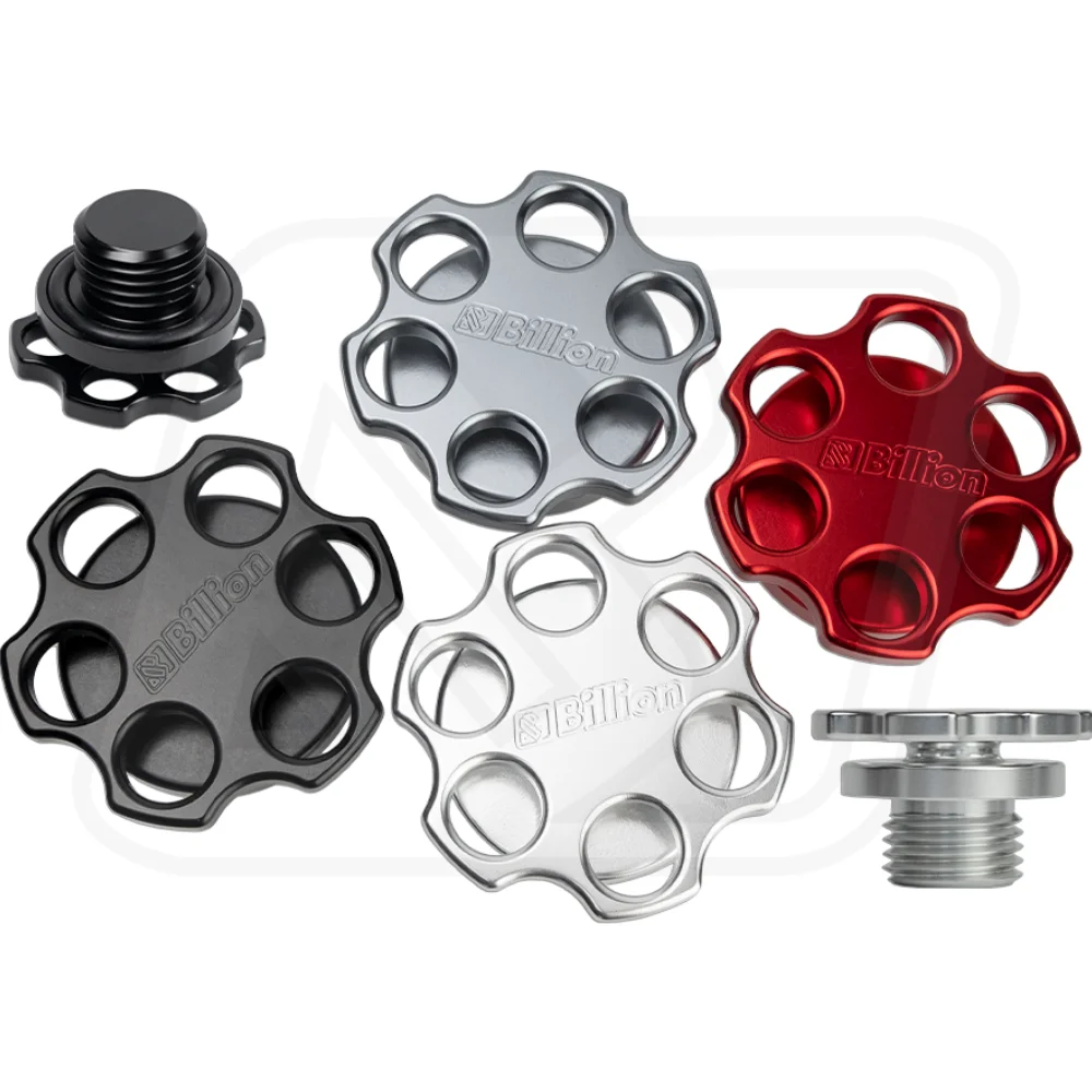 ฝาน้ำมันเครื่อง Billion SIX SHOOTER ฝาแต่งสไตล์เรซซิ่ง ผลิตจากวัสดุอลูมิเนียม ผ่านกระบวนการกลึง CNC ที่ละเอียดและแม่นยำ ดีไซน์หกเหลี่ยมแบบ “SIX SHOOTER” โดดเด่นด้วยโลโก้ Billion Motorsport เพิ่มความสปอร์ตให้ห้องเครื่อง และยังช่วยระบายความร้อนได้ดี
